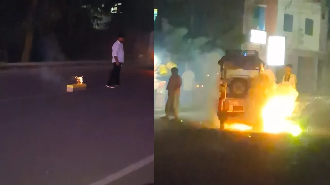 రోడ్డు మధ్యలో టపాసులు.. ఒక్కసారిగా దూసుకొచ్చిన ఎలక్ట్రిక్ ఆటో…జాతిరత్నాల సీన్